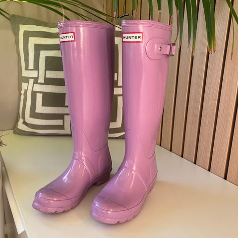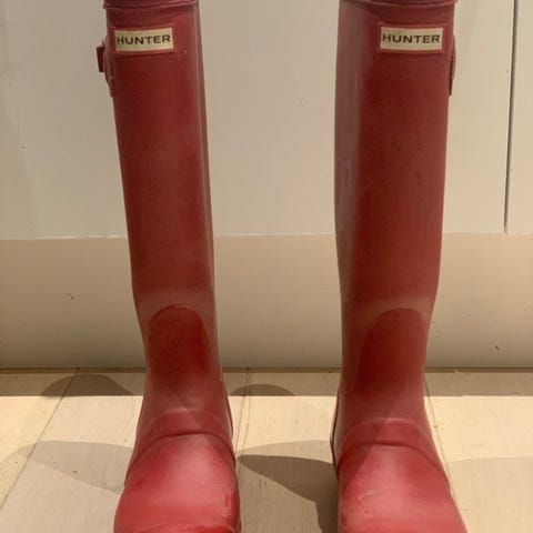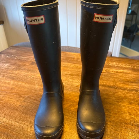 Hunter gummistøvler for jenter/ damer i størrelse 38. Dette er i utgangspunktet er en høy modell for voksne, ikke barnemodell, men kan passe til junior som har voksenhøyde. Støvlene er svarte og laget av gummi, egnet for bruk i våte og gjørmete forhold.