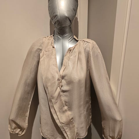 Ren silkebluse med 3/4 lang arm og råkanter. Str er 34, men jeg er str 38 og passer den fint, alt avhengig av hvor løs man vil den skal sitte. Fargen vil jeg beskrive som mørk creme/ lys champagne. Lite brukt, ingen anmerkninger