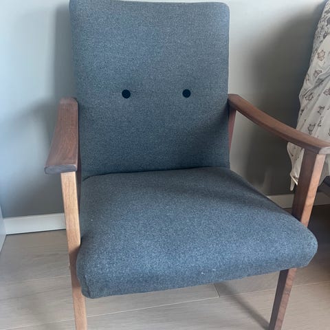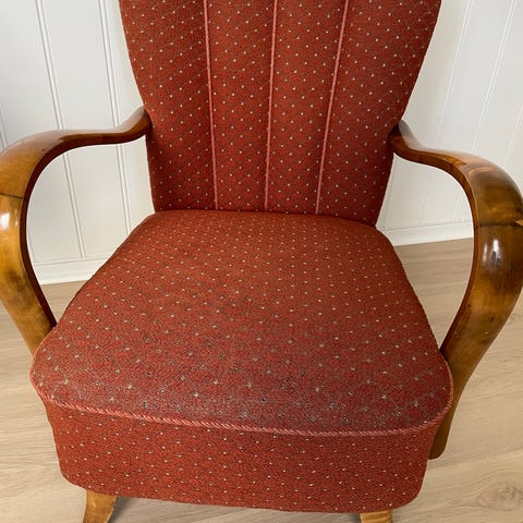 Pent brukt og godt bevart med normal aldersslitasje. Ingen slark, stabil og behagelig å sitte i. Et tidløst møbel som passer perfekt i retro-, vintage- eller moderne interiør.
