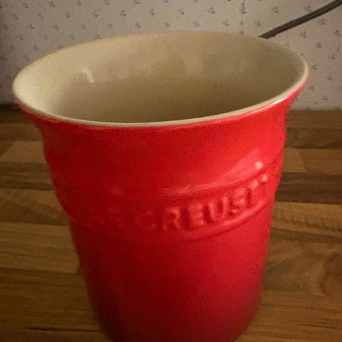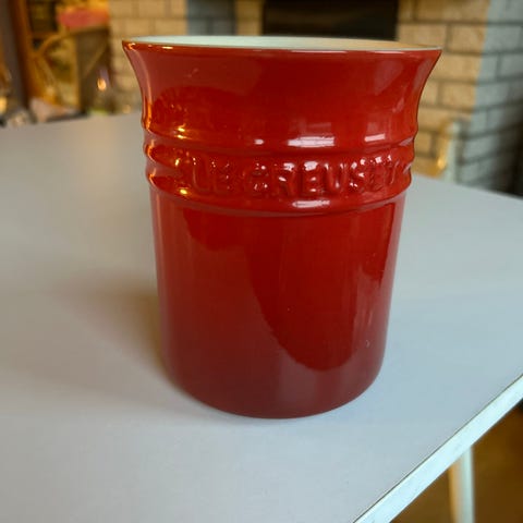 Le Creuset keramikkrukke i lys beige. Fin til oppbevaring av kjøkkenredskaper eller f.eks krydderurter. Høyde 14,8 cm og bredde/diameter 12,5 cm.
