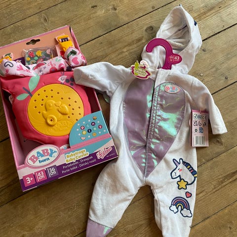 "Baby Born er alltid sulten som en bjørn. Men hun tar det like rolig som bjørnen Bruno i stolryggen. Med dette praktiske tilbehøret sitter Baby Born alltid ved bordet når de voksne spiser. På den måten får hun en skje av alles måltid. Selvfølgelig bør du alltid vaske hendene før du spiser. At det står «vask hendene» på det lille rosa bordet minner henne om det – for sikkerhets skyld".