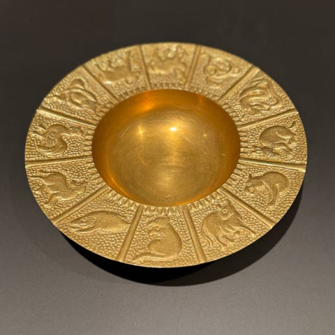 Selger en vakker, vintage messingbolle med elegant stett. Bollen er stemplet "DENMARK" under, noe som indikerer dansk design og kvalitet, mest sannsynlig fra midten av 1900-tallet.