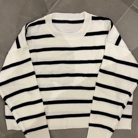 Meget pent brukt Gina Tricot stripete genser. Denne genser er et must i garderoben. Str er XS, men den er stor i størrelsen og skal være oversized for den som liker det.