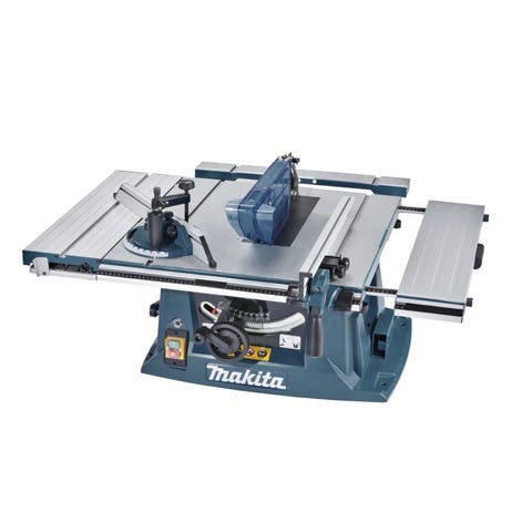 Sagen er montert på et originalt solid Makita bord med 2 hjul. Den kan enkelt senkes og heves og kan settes på høykant for å ta mindre plass ved lagring.