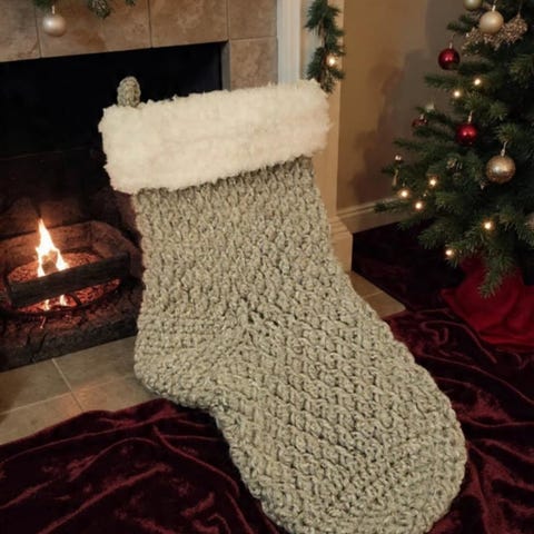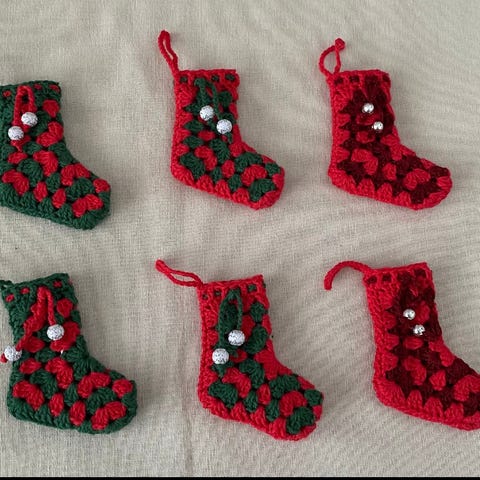 Håndlagde julestrømper heklet i et solid akrylgarn for å vare. Heklet i en teknikk som gjør de elastiske nok til å få plass til mye samtidig som de holder innholdet inni strømpen. Ca. 40 cm lang.