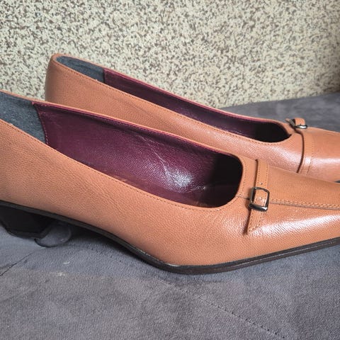 Pensko i skinn fra Clarks selges kr 70,- De er str 39, hele og pene sko. Skinnsko / ballerinasko - behagelige på bena.