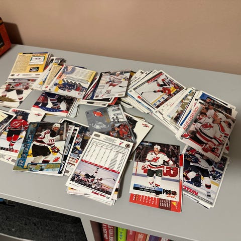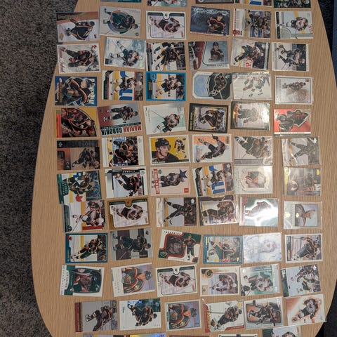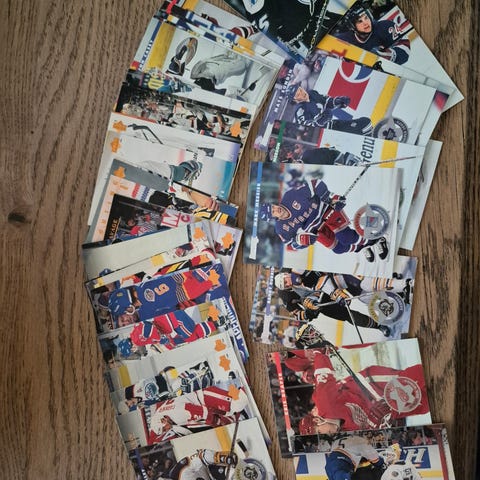 Samling av sports-kort med ishockey- og basketballtema. Kortene viser ulike spillere i aksjon, med forskjellige lagdrakter og farger. Kortene er organisert i plastlommer for samling og oppbevaring.