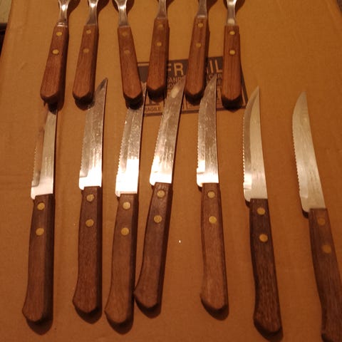 Søkeord tramontina biffkniver biffbestikk steak knives faqueiro linha tradicional inox stainless trehåndtak grill bestikksett retro vintage brasil