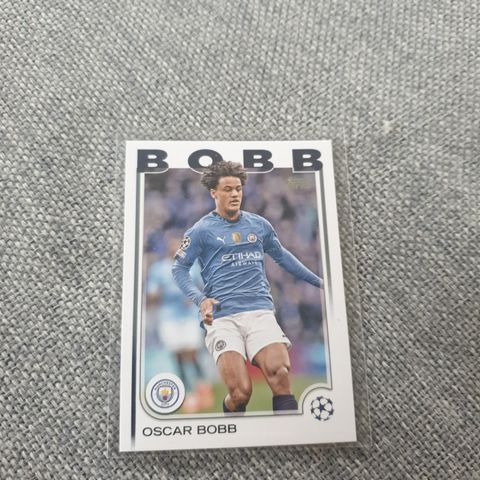 Topps Oscar Bobb Midfielder fotballkort med bilde av spilleren i Manchester City-drakt. Kortet har et blått bakgrunnsdesign med måne og klubbens logo. Tekst på baksiden beskriver spillerens egenskaper og prestasjoner.