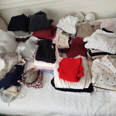 Klespakke til en jente på 8 til 10 år, størrelse 134/140. For det meste skjorter og overdeler. Mesteparten er pent brukt, noe er synlig brukt. I alt 34 plagg. Selges samlet. Kan sendes.