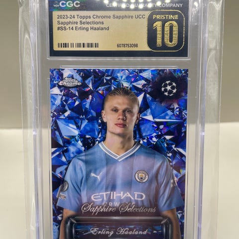 Topps Chrome UEFA 2023-24 Erling Haaland fotballkort med høy kvalitet. Kortet er vurdert til GEM MINT 10 av Certified Guaranty Company (CGC).