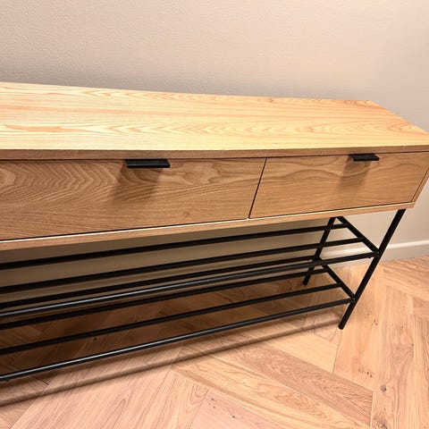 Super-lekker vegghylle i svart støpejern og hyller i hvit eik selges til under halv pris av ny. Ingen synlige skader eller bruksmerker. Kan selges samlet med liknende i mindre størrelse til samlepris 7000,-