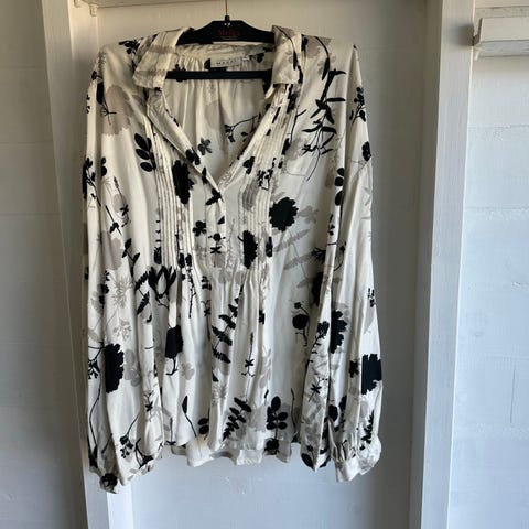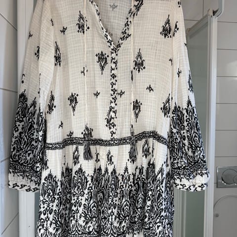 H&M hverdagskjole i størrelse M, Kjolen er hvit med svart paisley-mønster og har knapper foran. Materialet er lett og egnet for hverdagsbruk.