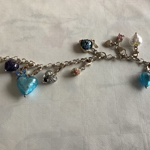 Sølvarmbånd fra Sterlinks med 8 charms i blå og hvite nyanser. Elegant og tidløst design – passer både til hverdag og fest. Pent brukt / lite brukt.