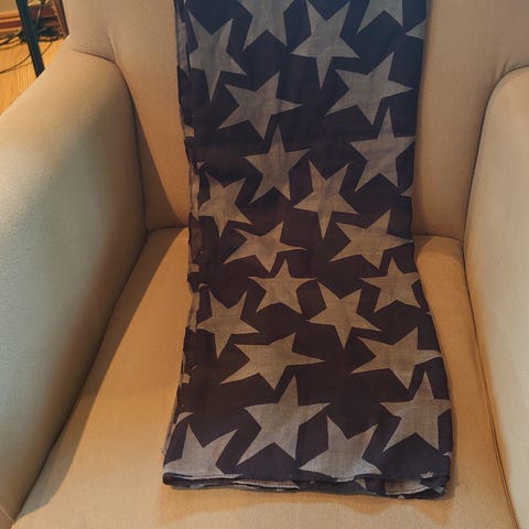 Grønt/grått/creme farget skjerf. 200 cm langt, 47 cm bredt.