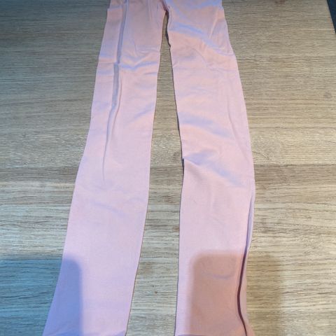 Pent brukt rosa tights, med "skinnfelt" foran. Har en ekstra søm under beina. Ikke synlig. Str. 122/128.