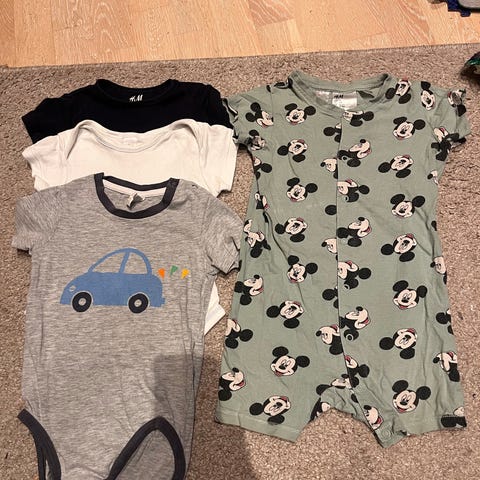 Liten klespakke med 6 bodyer str 86. Pent brukt. Fra blant annet Name it, Disney og H&M.