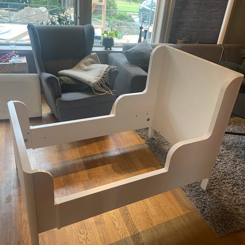 Selger fin busunge seng som vokser sammen med barnet. Følger med madrass, sengekant og himmelseng. Sengen kan selges separat.