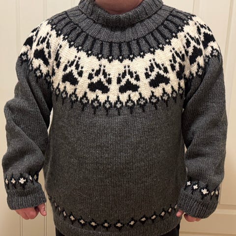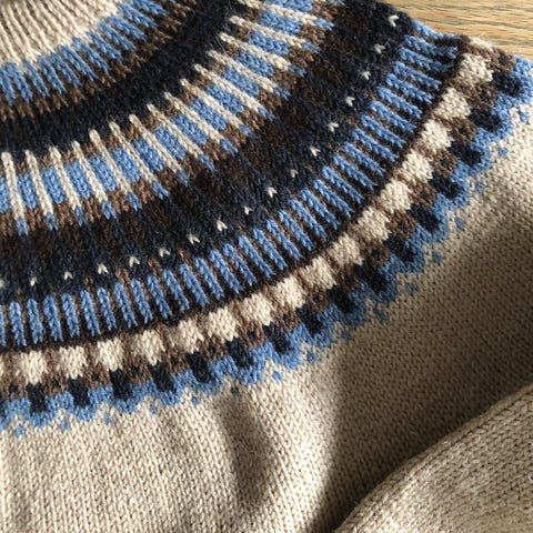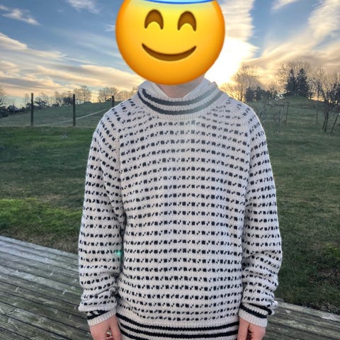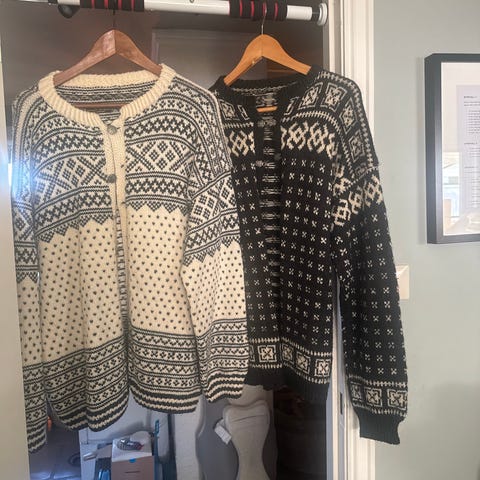 Hjemmestrikket islender i marineblå og offwhite selges 1500, -