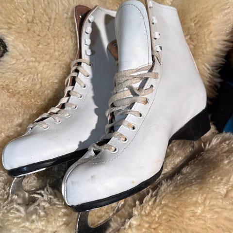 Jofa kunstløpskøyter i størrelse 42 med hvitt skinnmateriale. Skøytene har tradisjonell snøring og er utstyrt med metallskøyteblader. Kalosjer medfølger.