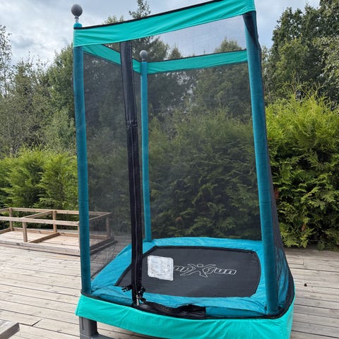 Liten trampoline for sprettne barn, passer like bra innendørs som utendørs. Nett og alt følger med så det også kan brukes som en slags ballbinge
