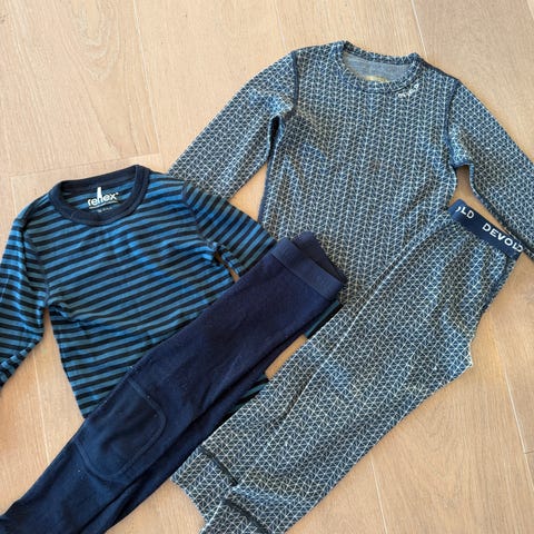 Ingen hull. Normal slitasje. En overdel og en underdel fra Norheim, to underdelen fra Refleks med knelapper og en overdel fra Devold. Alt størrelse 98-104 eller 104. Devoldtrøya er størrelse 4 år. Den er bare litt lenger i livet enn 104'n faktisk (Se bilde).