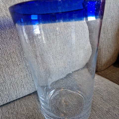 Hadeland Glassverk glassvase med blå kant. Laget av klart glass med bobler i materialet, gir et dekorativt uttrykk. Passer til bruk som vase eller dekorasjon i hjemmet.