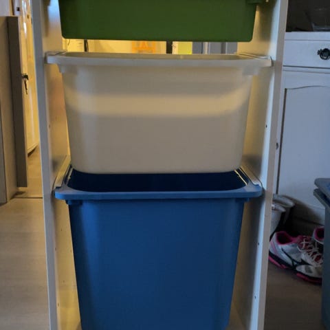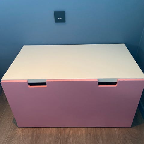 IKEA oppbevaring laget i tre. Består av flere trinn med integrerte oppbevaringsbokser i forskjellige farger. Passer for barnerommet med god plass i boksene til lagring av leker.