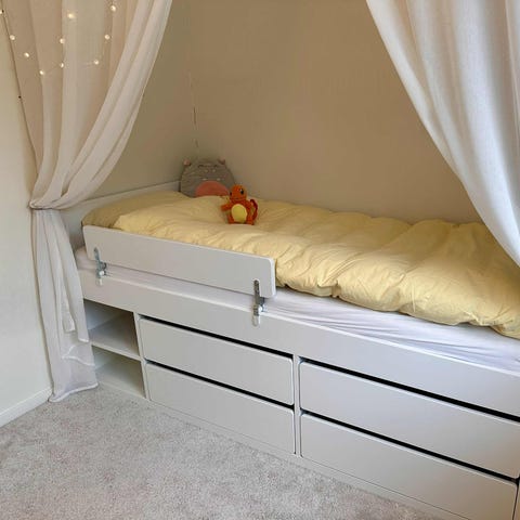 90 cm bred seng med skuff under, der det er plass til en ekstra madrass. Madrasser kan følge med.