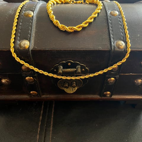 «Smykket er laget av rustfritt stål, forgylt med 14 karat gull. Overflaten på det ytterste hjertet har et eksklusivt rillemønster. Halskjedet er selvfølgelig bly- og nikkelfritt.»