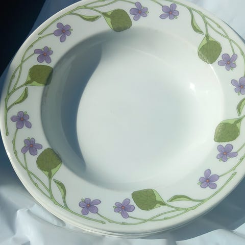 Søkeord churchill england dyp tallerken soup bowl skål grønn kant blå blomster friendly creepy crawlies tekst dekor keramikk servise barneservise frokost suppe pastatallerken vintage britisk english dinnerware