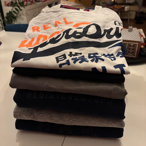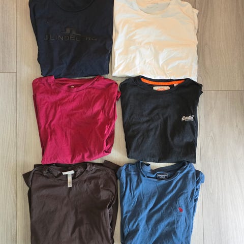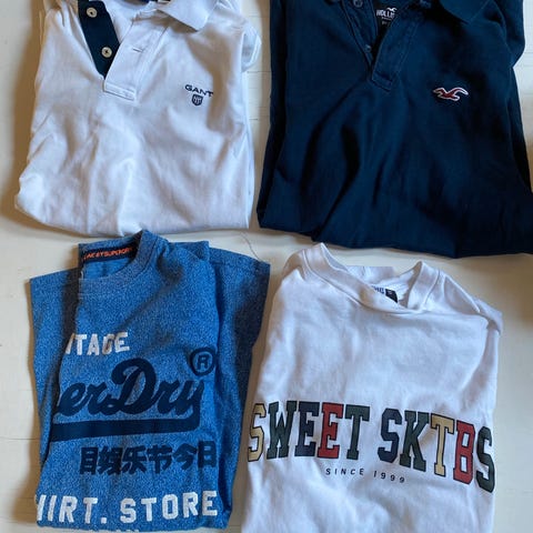 4 stk superdry t-shorter, 1 superdry genser og G-Star bukse selges samlet. T-shortene er som nye unntatt den rosa, genseren ikke brukt. Buksa er sydd opp da den var aaaalt for lang da jeg kjøpte den, er mer en 33/32-34 enn 33/55 som den var. Passer meg som er XL.