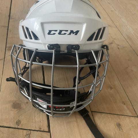 Meget pent brukt CCM ishockeyhjelm med avtagbart gitter i hvit farge. Hjelmen gir beskyttelse til hodet under spill. Gitteret beskytter ansiktet og sikrer god sikt.