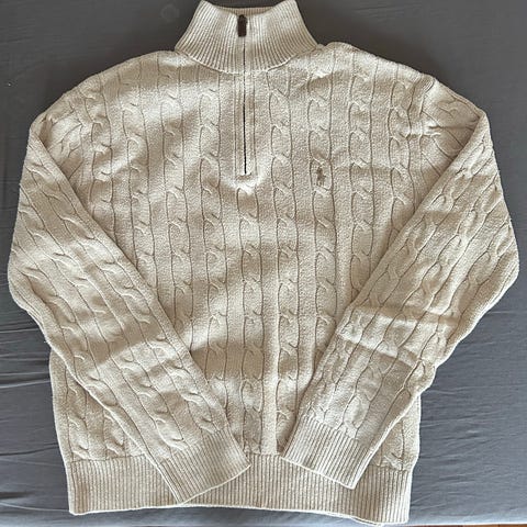 Ralph Lauren Polo ullgenser i svart farge, størrelse M. Genseren er laget av ull og har en halv glidelås i front. Den har et klassisk flettemønster (cable knit) og brodert logo på brystet.