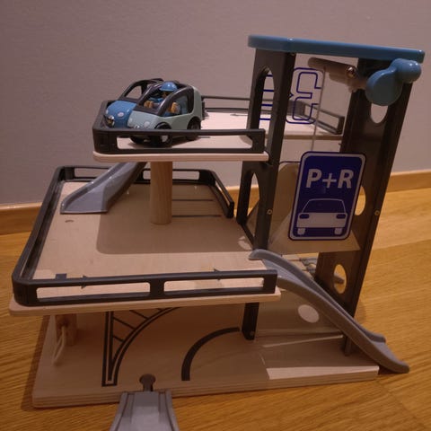 Meget pent brukt BRIO parkeringshus selges. Kan kobles sammen med BRIO togbane. Parkeringshus med tre etasjer, bil-rutsje og heis. Selges sammen med 4 små lekebiler.