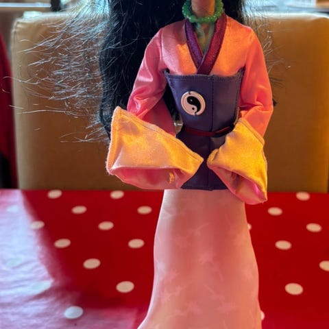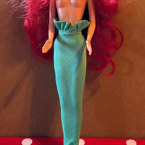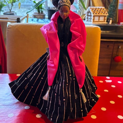 Barbie dukke iført en lilla kjole med blomstrete overdel og detaljer i lilla. Kjolen har puffete ermer og er laget av tekstilmateriale. Dukken har langt blondt hår som er festet i en høy hestehale. Dukken er fra 90-tallet.
