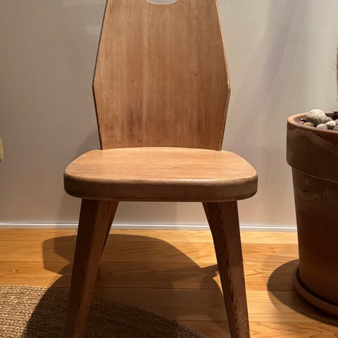 Treverket, bena og side"håndtak" har blitt pusset og oljet. Krakken har blitt trukket i nytt rødt ullstoff. Ellers er den meget pent brukt og fremstår som et velholdt vakkert møbel.