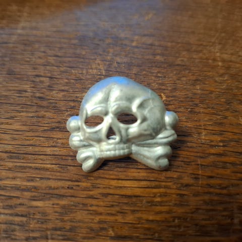 Selges Fredsharsjed 1945 pins nål med dekorativt motiv av to personer og laurbærkrans. Metallmateriale, liten størrelse egnet for bruk på klær eller hatter.