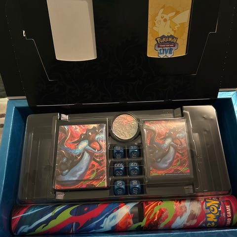 Pokémon TCG Playmat med motiv av Charizard, og en matchende Deck Box.