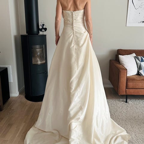 Denne elegante brudekjolen viser en sofistikert kombinasjon av intrikate blonder og mykt chiffonstoff. Designet har en flatterende V-hals og 1/2-ermer, som gir en tidløs og grasiøs silhuett. Perfekt for bruder som søker en klassisk, men raffinert brudelook.