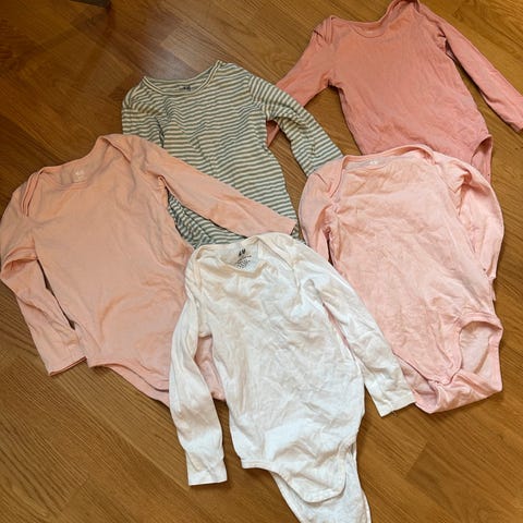 Langermede bodyer i supermyk bomullstrikot med omslagslagte skuldre og skjulte trykk-knapper i kilen for enkelt bleieskift.