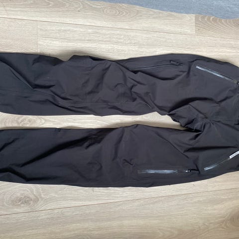 Buksen har glidelåser på baksiden, samt en stropp som går mellom beina og to skjørtekanter på foran og bakside. Stoffet er sateng. Pent brukt.