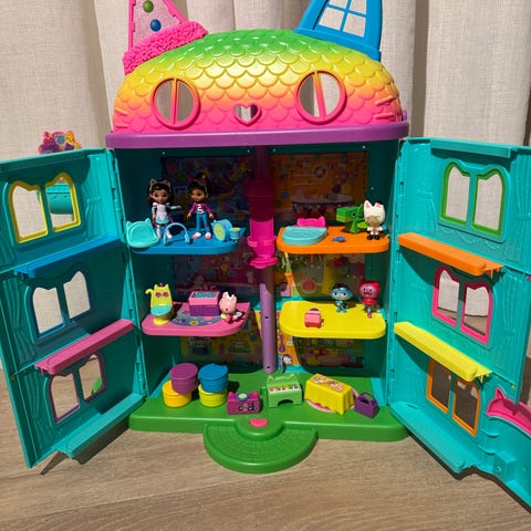 Gabbys dukkehus/dollhouse lekesett som inkluderer alle 6 rom og flere små dukker, møbler og masse tilbehør. Settet består av et fleretasjes lekehus med ulike rom og funksjoner, samt mange små gjenstander som kan brukes til rollelek. Passer for barn som liker å leke med dukker og bygge fantasiverdener. Må hentes på Kløfta eller Ulven
