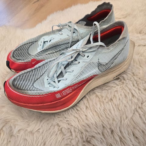 Nike zoomx vaporfly next %3 joggesko i størrelse 44, svart farge. Fungerer som str 43. Raskeste karbon konkurranse sko på markedet. Ekstremt lette med sterkt slitestoff. Selges fordi jeg har for mange karbon sko. Skoene er brukt veldig lite, 15-20km maks. Kjøpt ny på løpelabbe på Ski storsenter. Har kvittering. Ny pris 3,4k.