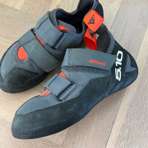 Lasportiva Stickit Klatresko i størrelse 32-33 med gul, grønn og grå farge. Laget av skinn med lær i overdelen og sålen.