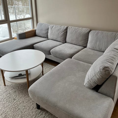 Stilren og komfortabel sofa med vendbar sjeselong selges. Sofaen har et moderne og tidløst uttrykk som passer inn i de fleste hjem. Putetrekkene har glidelåsåpning og putene er også vendbare noe som gir sofaen lengre levetid.