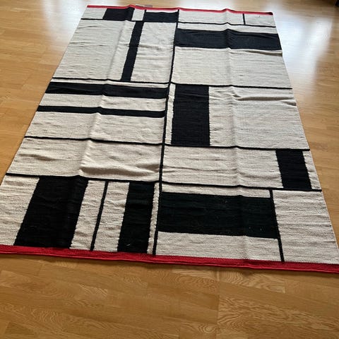 Teppe i 60% ull, 30 % polyester og 10% lin. Teppet har noen bruksmerker, derfor la pris. Vil beskrive fargen som melert varmgrå