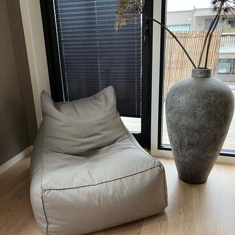 Kjempegod å sitte i og enkel og lett å flytte på, om man skal bære den er det et håndtak bak enden av ryggen på den.