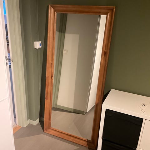IKEA speil med dekorativ gyllen ramme. Speilet har en bred, utsmykket kant som gir et klassisk uttrykk. Passer for oppheng på vegg og kan brukes i ulike rom som stue, gang eller soverom.