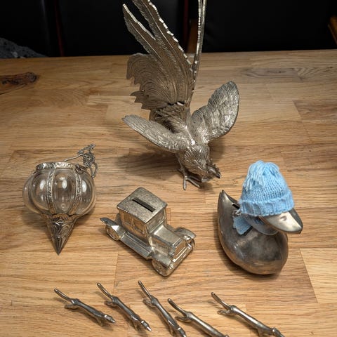 Div pynt selges. Tror det er nysølv . Det ene geviret er brekt. Det følger med og kan limes på . Selges samlett